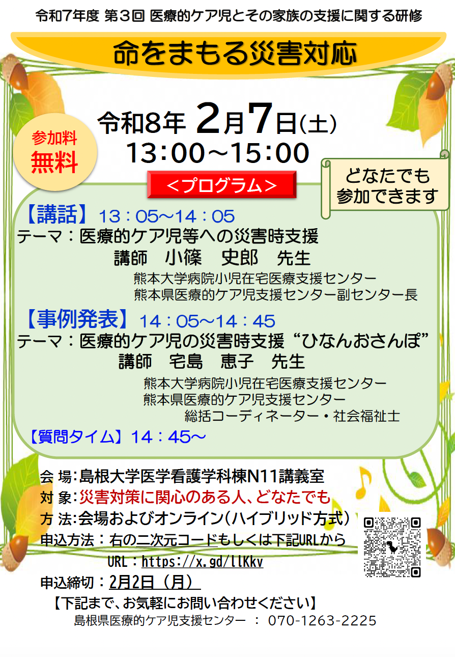 | 問い合わせ先 | 島根県医療的ケア児支援センター:070-1263-2225 |
